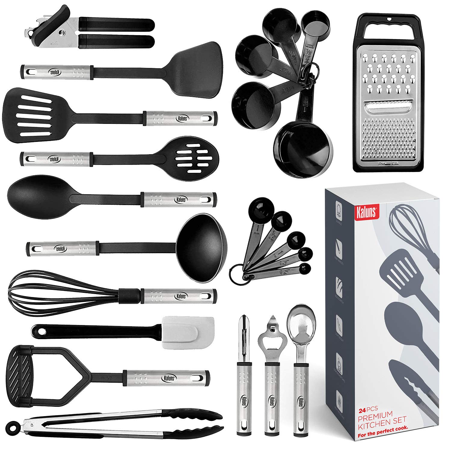 お買い得なナイロンとステンレススチールのキッチン用品セット: 一つ一つ一つ買って大金を費やす必要はありません。 キッチンツールセットをぜひお買い求めください。 当社の 24 ピース高品質セットには必要なものがすべて揃っています。 泡立て、ピーリング、カッティング、攪拌、ミキシング、ベイスティング、グリル、フライ、完璧なお皿の盛り付けなど、すべての食品準備を手助けするために特別に設計されています。